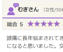頭痛に長年悩まされてきましたが、治療後はあたまがすっきりして目の奥の痛みも軽減しました。カッピングで血行もよくなり、身体が楽になると思いました。交通事故のむち打ち症の首の痛みもも楽になってきています